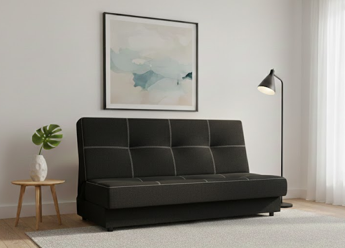Łatwy w obsłudze mechanizm otwierana pozwoli na szybką zmianę mebla do dziennego wypoczynku w wygodne łóżko, a w pojemniku na pościel schowasz wszystko co do potrzebne do spokojnego snu.