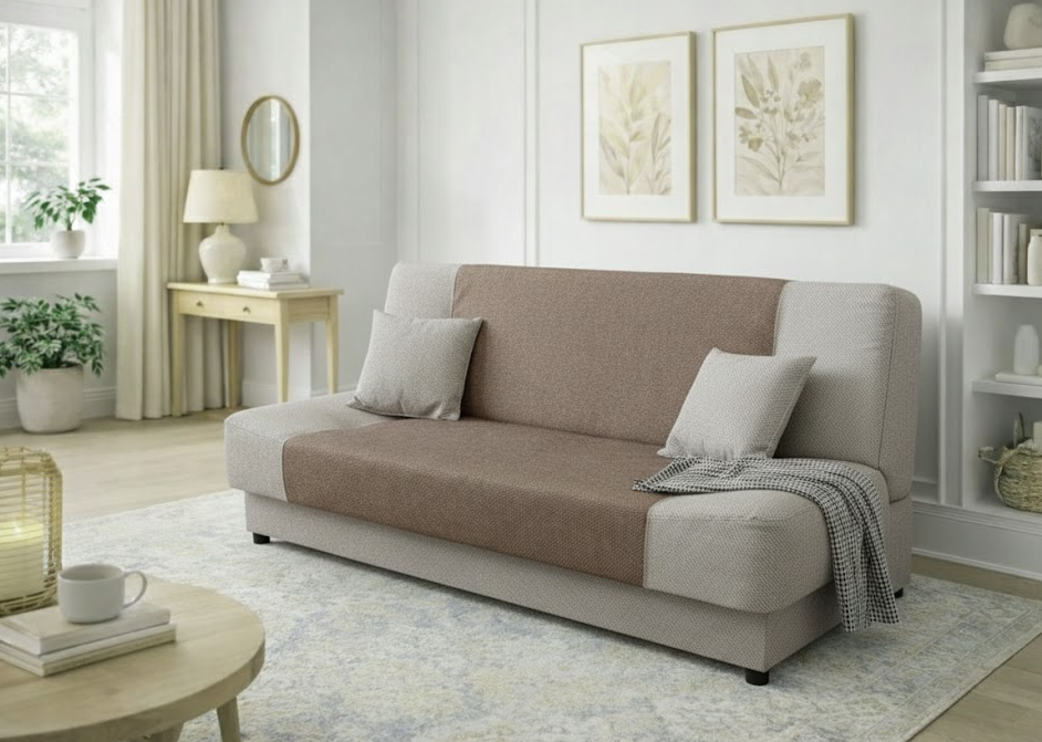 Wersalka Jaś 10/03 szaro-brązowy melanż na sprężynach z funkcją spania i pojemnikiem
