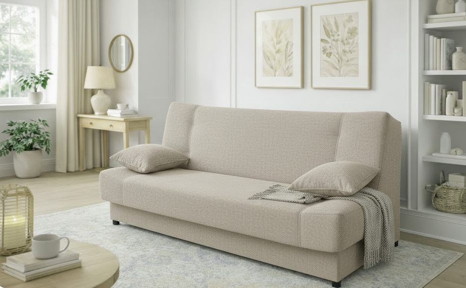 Wersalka Jaś jasny beż melanż na sprężynach z funkcją spania i pojemnikiem