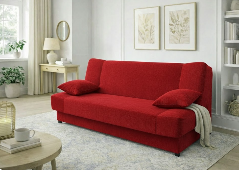 WERSALKA KANAPA JAŚ miękka tkanina czerwona rozkładana pojemnik sprężyny Marka Platan Sofa
