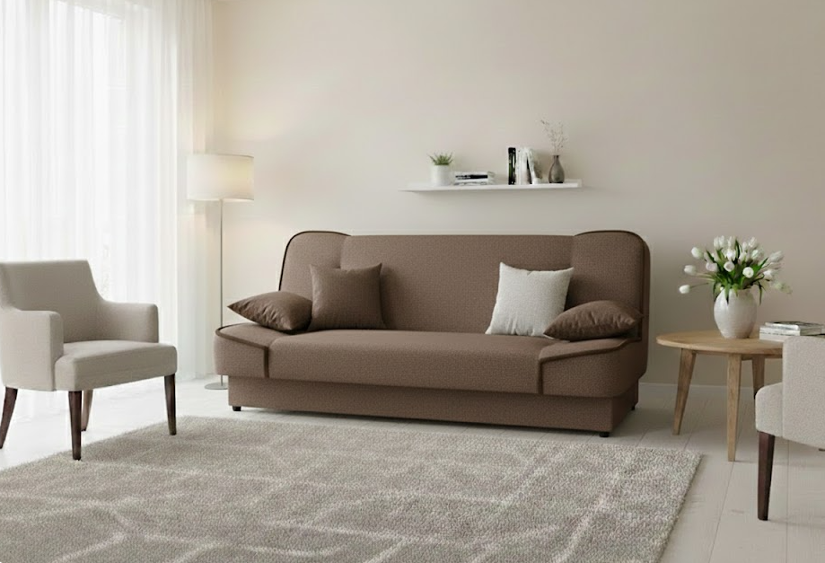 Strona główna » Sofy i Wersalki » Wersalka Maxim II 15 brąz melanż na sprężynach z funkcją spania i pojemnikiem