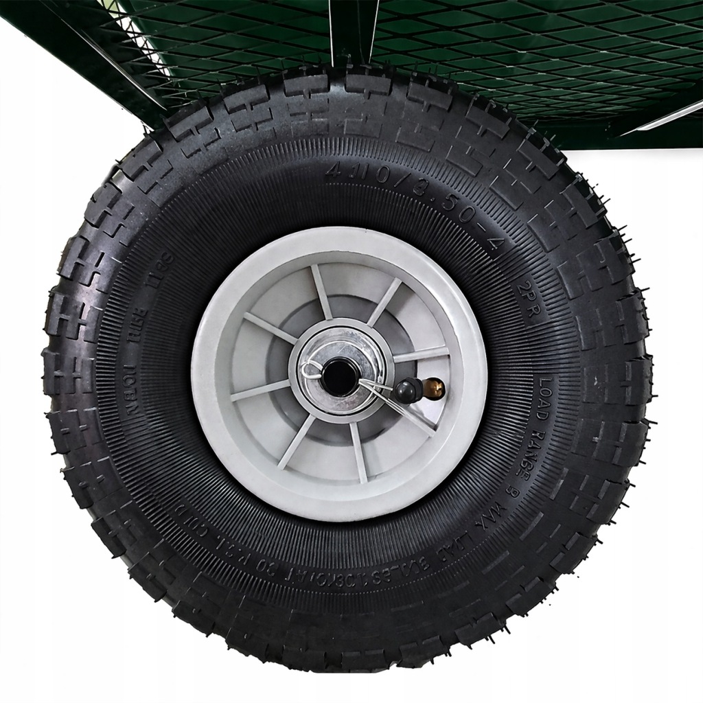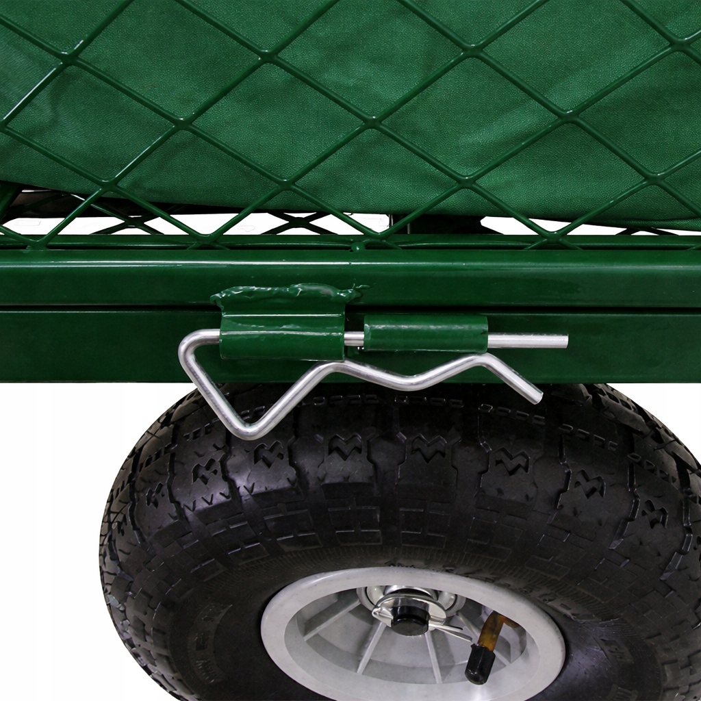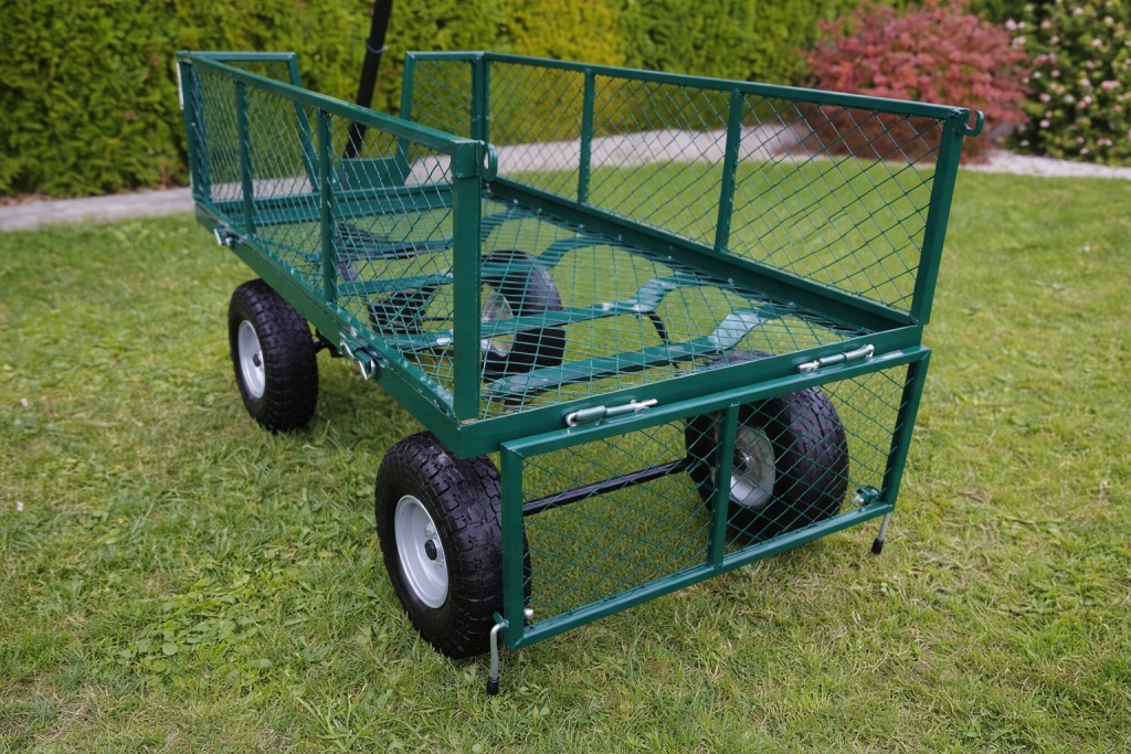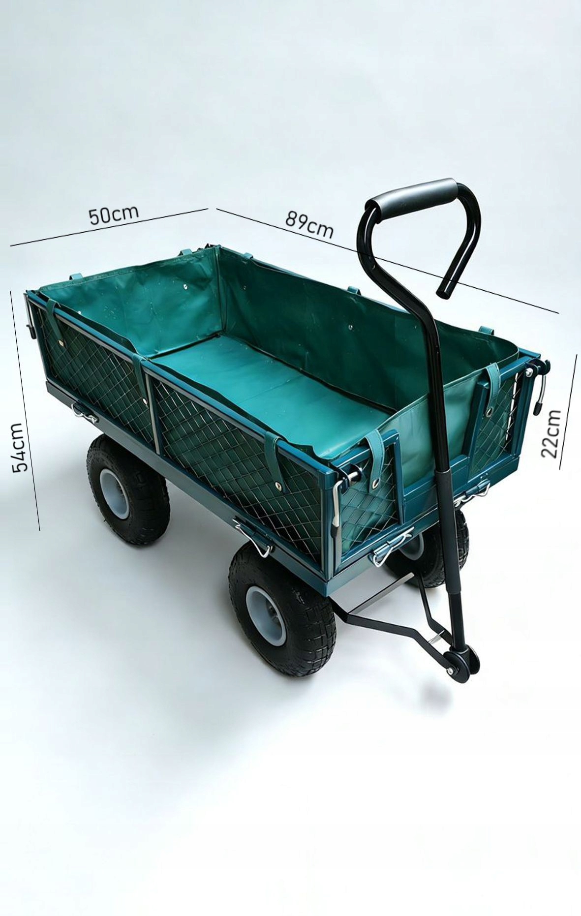 Szeroka skrzynia z wysokimi bokami pozwala przewozić sporo materiału – od narzędzi i ziemi po rośliny czy zakupy.