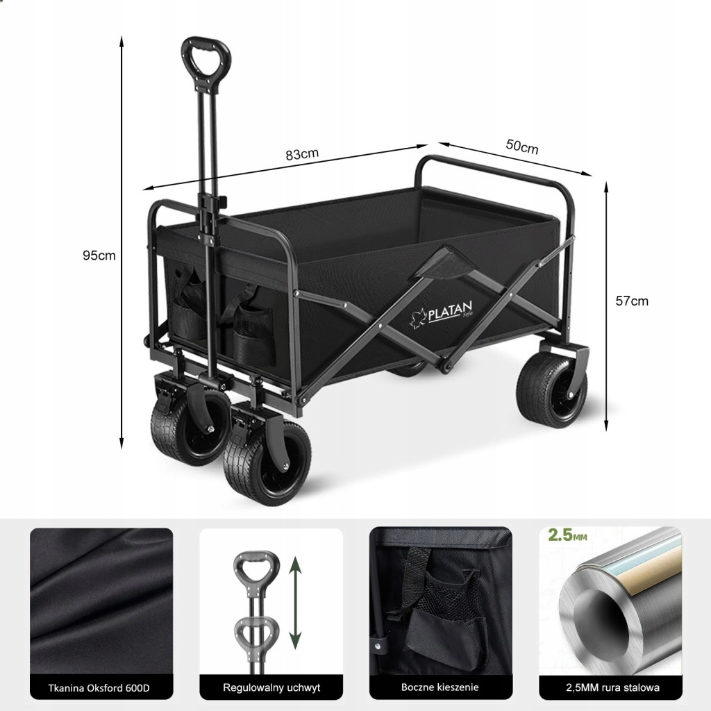 Sprawdzi się on doskonale nie tylko na plaży ale także w ogrodzie do transportu narzędzi, nawozów i innych materiałów niezbędnych w ogrodzie. Będzie również niezastąpiony podczas organizacji eventów, gdzie wymagana jest szybka i efektywna logistyka. Ten solidny składany wózek transportowy to niezastąpiony pomocnik w każdej sytuacji. Lekki, a jednocześnie bardzo wytrzymały, zapewnia komfort i oszczędza siły – koniec z noszeniem ciężkich toreb, leżaków czy zabawek!