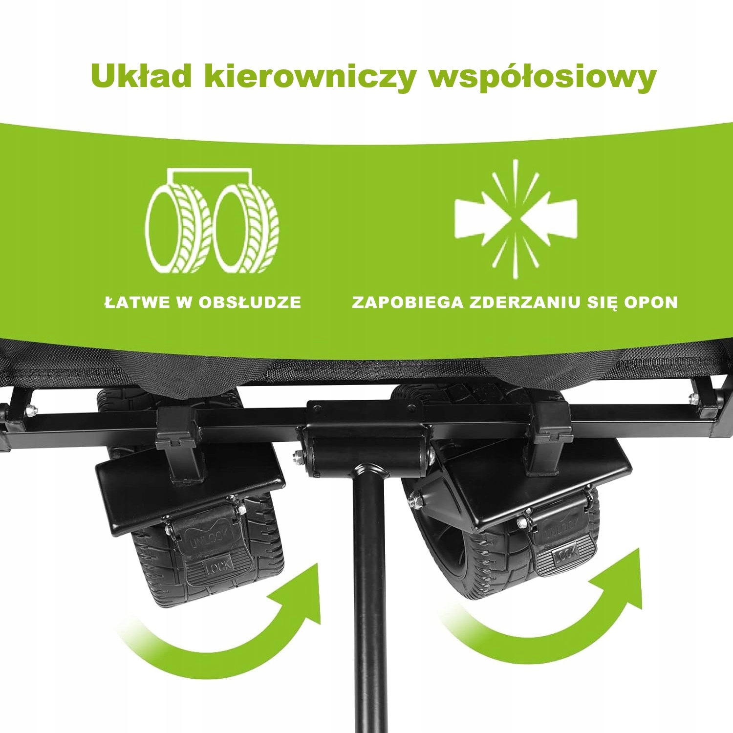 wózek wyposażony jest w szerokie bieżnikowane koła wykonane z wysokiej jakości materiału PVC, które zapewniają stabilność i łatwość manewrowania na różnych powierzchniach. Koła z przodu wózka są skrętne w pełnym zakresie 360 stopni, co umożliwia precyzyjne sterowanie i łatwe manewrowanie w ciasnych przestrzeniach. Ponadto posiadają hamulce / blokady, co gwarantuje bezpieczeństwo i stabilność podczas załadunku oraz rozładunku. Duże, bieżnikowane koła to pewność, że wózek pokona zarówno piaszczystą plażę, jak i nieutwardzony grunt w ogrodzie.